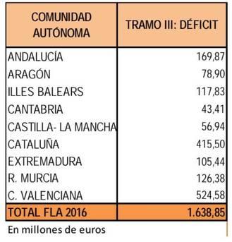 En la reunión de este jueves también se conoció que el Consejo de Ministros aprobará hoy el llamado 'extraFLA', que corresponde a las desviaciones de déficit del año 2015. Su dotación será de 1.638 millones. En este caso, Madrid podrá disponer de unos 270 millones adicionales.Con esa cifra, el total del extraFLA correspondiente al déficit de 2015 ascenderá a 6.055 millones de euros.