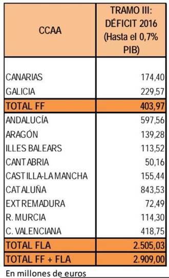 Por último, Hacienda anunció ayer que en la comisión delegada del Gobierno para asuntos económicos, que tendrá lugar este viernes, tras la celebración del Consejo de Ministros, se acordará designar 2.909 millones de euros de los recursos previstos del Fondo de Financiación a Comunidades Autónomas 2016 derivados de la ampliación del objetivo de déficit del 0,3% al 0,7% del PIB regional.