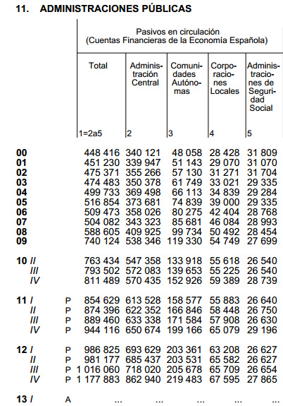 1.057.835.000.000 euros. O lo que es lo mismo, algo más de 1,057 billones de euros. Eso es, exactamente, lo que adeuda el sector público. Lo acaba de revelar el Banco de España en su informe estadístico y supone que, por primera vez, los pasivos emitidos por el Reino de España -incluidas todas las administraciones públicas- superan el Producto Interior Bruto, y que en 2012 ascendió a 1,049 billones.