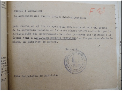El sumario de la Marina 544/39 es una prueba jurídicamente irrebatible, de la comisión de un asesinato judicial perpetrado en Cartagena por un tribunal militar de la marina franquista en 1940.