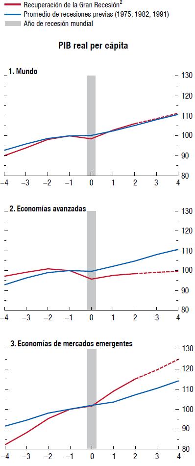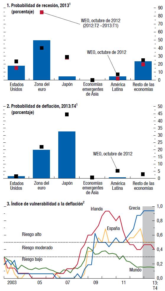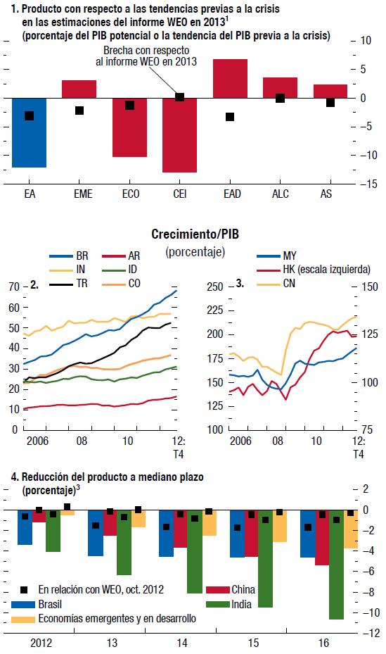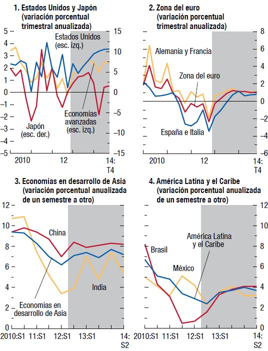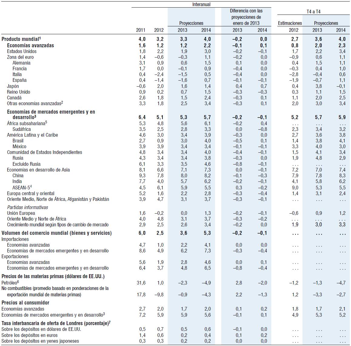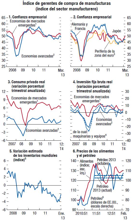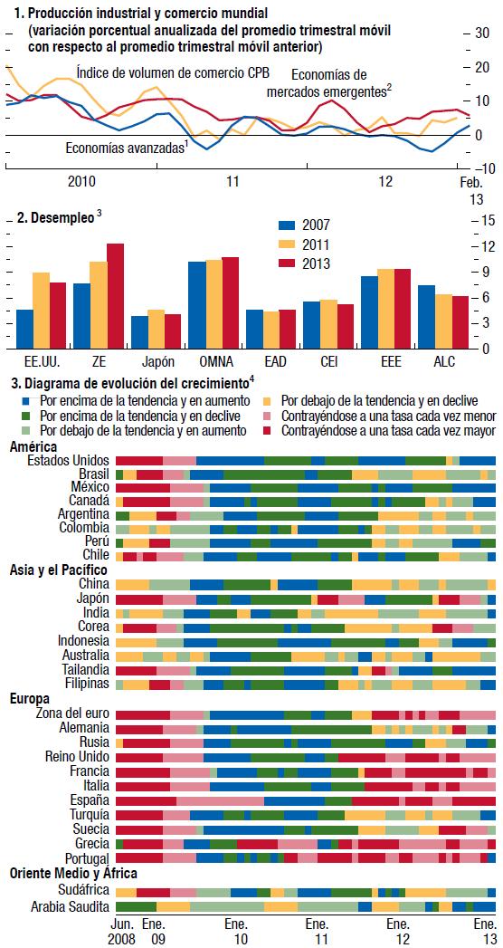 Las perspectivas económicas mundiales han vuelto a mejorar, pero el camino hacia la recuperación en las economías avanzadas seguirá siendo accidentado. Se pronostica que el producto mundial crecerá 3¼% en 2013 y 4% en 2014. En las economías avanzadas se prevé que la actividad se acelerará gradualmente a partir del segundo semestre de 2013. La demanda privada parece ser cada vez más robusta en Estados Unidos pero aún es muy floja en la zona del euro. En las economías de mercados emergentes y en desarrollo, la actividad ya ha recuperado su impulso.