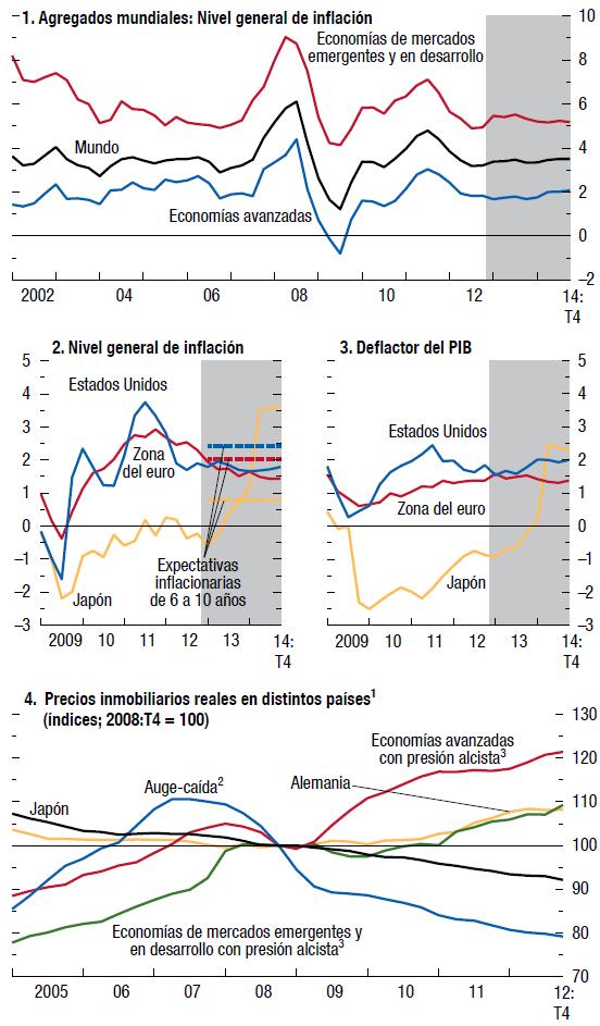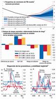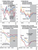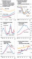 Para el futuro se pronostican niveles bajos para las tasas de interés de política monetaria en las principales economías avanzadas (gráfico 1.4, panel 1), y se espera que dichas tasas se traduzcan lentamente en un crédito bancario más dinámico, siempre que los riesgos para la estabilidad financiera continúen disipándose. Este proceso demorará mucho más en la zona del euro que en Estados Unidos. En Japón, el nuevo marco de expansión cuantitativa y cualitativa de la política monetaria introduce un importante estímulo monetario adicional y debería ayudar a acelerar el cumplimiento de la nueva meta de inflación del 2% del Banco de Japón.