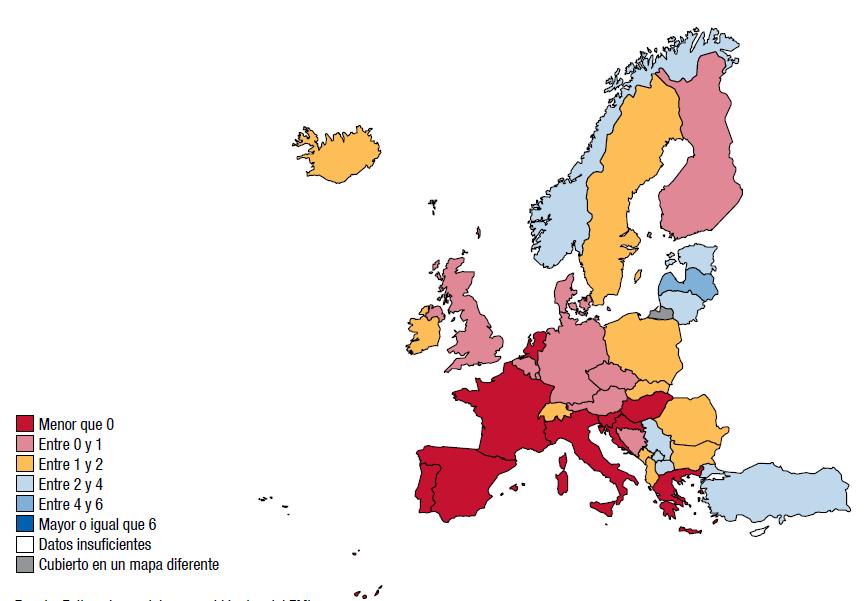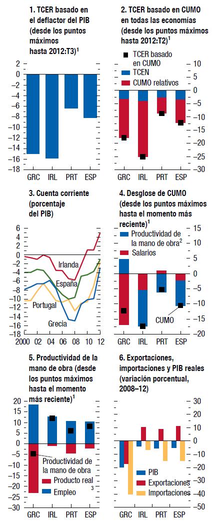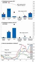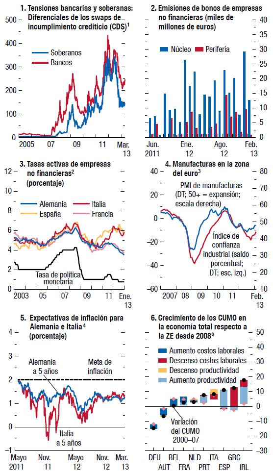 El pronóstico de crecimiento negativo en la zona del euro obedece no solo a la debilidad en la periferia sino también a cierta atonía en el núcleo. El crecimiento de Alemania está afianzándose, pero aun así se pronostica que será inferior al 1% en 2013. Para Francia se pronostica un crecimiento negativo en 2013, debido a una combinación de consolidación fiscal, flojo desempeño de las exportaciones y poca confianza. Esto puede poner en duda la capacidad del núcleo de la zona para ayudar a la periferia, en caso de que fuera necesario. Se prevé que la mayoría de los países de la periferia de la zona del euro, en particular España e Italia, sufrirán contracciones importantes en 2013. El proceso de devaluación interna está avanzando lentamente, y la competitividad de la mayoría de estos países está aumentando poco o poco. Sin embargo, la demanda externa sencillamente no es lo suficientemente fuerte como para compensar la débil demanda interna. Los círculos viciosos entre los bancos débiles, las entidades soberanas débiles y la escasa actividad continúan alimentándose mutuamente.