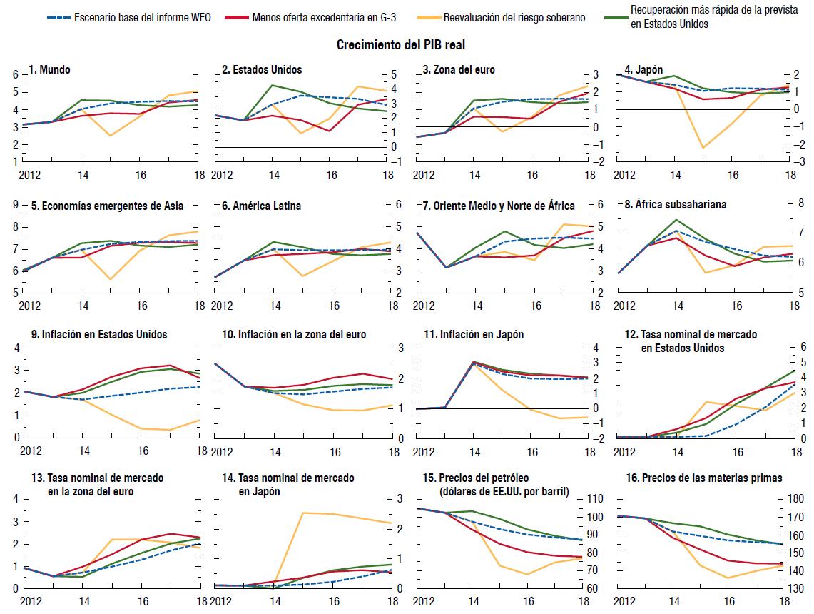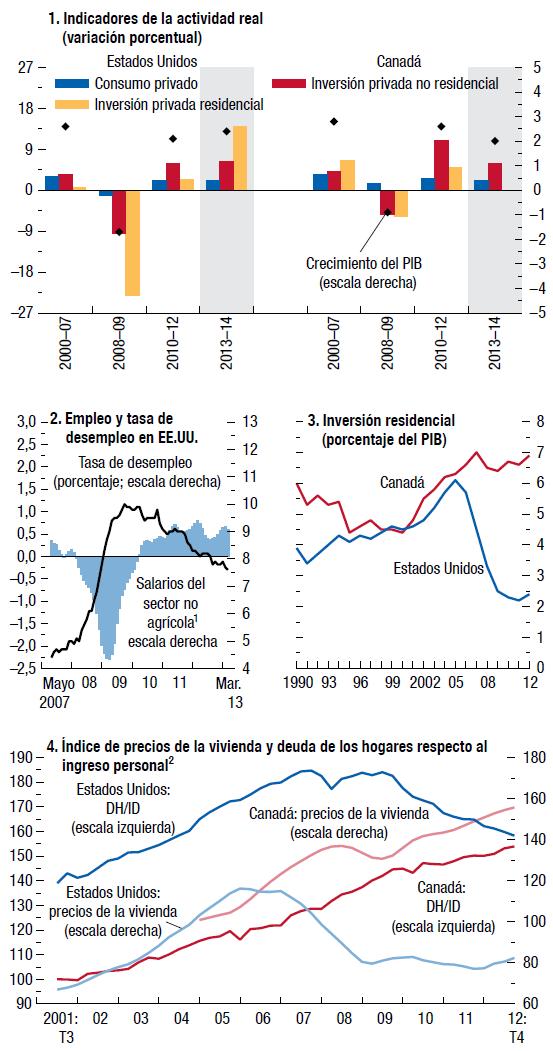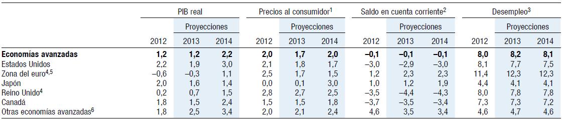 En general, el pronóstico de crecimiento anual para las economías avanzadas en 2013 --un moderado 1¼%-- no es mejor que el observado en 2012. Pero aun así, suponiendo que las autoridades evitan contratiempos y cumplen sus promesas, las proyecciones en esta edición de Perspectivas de la economía (informe WEO, por sus siglas en inglés) se basan en una continua atenuación de los factores que frenan la actividad real. Por lo tanto, para 2013 se proyecta que, tras un primer semestre flojo, el crecimiento del PIB real de las economías avanzadas se situará por encima del 2% el resto del año y promediará 2¼% en 2014, impulsado por un crecimiento de alrededor de 3% en Estados Unidos.