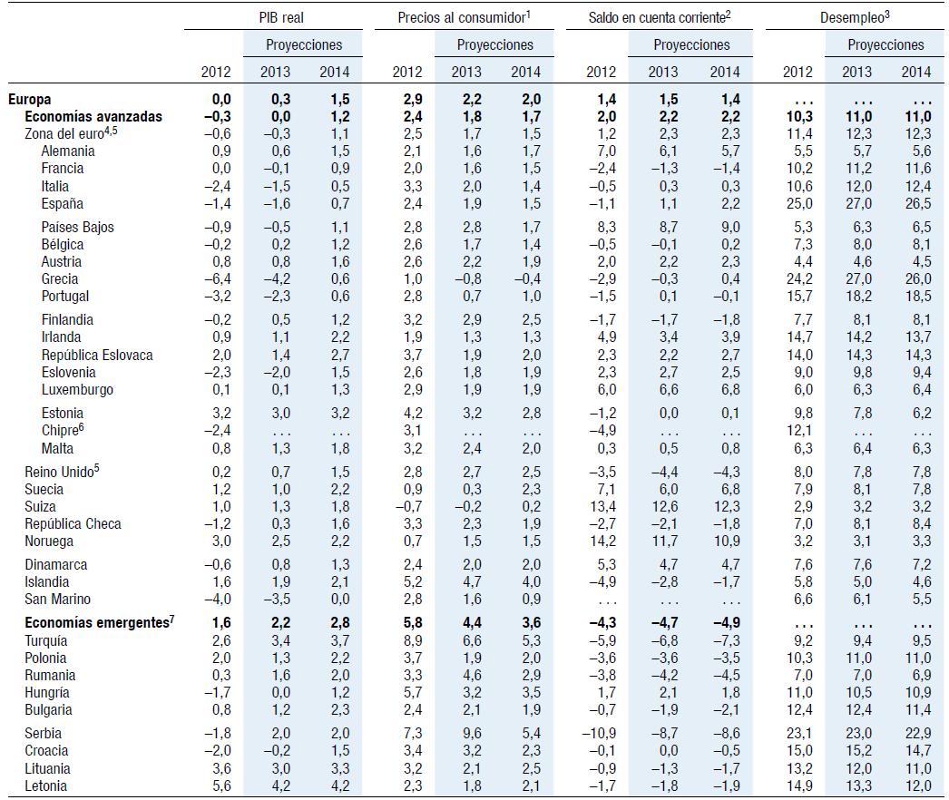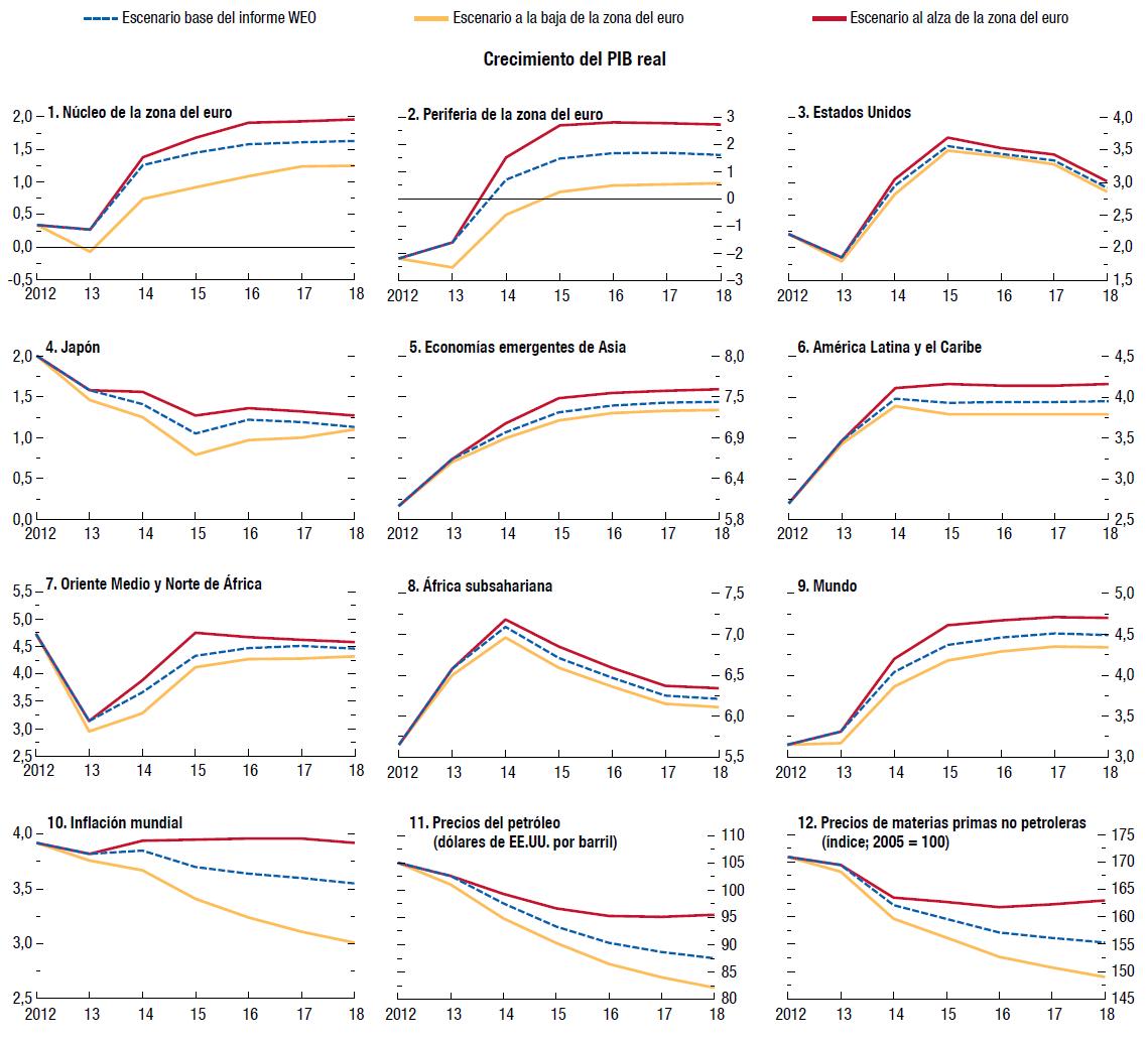 Nuestros pronósticos así lo reflejan. El crecimiento en las economías de mercados emergentes y en desarrollo alcanzará 5,3% en 2013 y 5,7% en 2014. En Estados Unidos, el pronóstico es de 1,9% en 2013 y 3,0% en 2014. En cambio, para la zona del euro se pronostica -0,3% en 2013 y 1,1% en 2014.