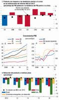 La actividad se ha estabilizado en las economías avanzadas y ha repuntado en las economías de mercados emergentes y en desarrollo, gracias al apoyo de las políticas y a un resurgimiento de la confianza. Antes de este repunte se había registrado una desaceleración en el primer semestre de 2012, que se vio reflejada en la producción industrial y el comercio internacional (gráfico 1.1, panel 1). La inversión en las principales economías también se contrajo, en tanto que el consumo evolucionó en general conforme a lo previsto, es decir, lentamente en muchas economías avanzadas, frenado por las bajas tasas de desempleo (gráfico 1.2, paneles 3 y 4), y con dinamismo en muchas economías de mercados emergentes y en desarrollo, donde los mercados laborales continúan evolucionando positivamente (gráfico 1.1, panel 2).