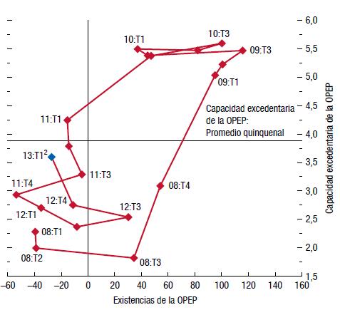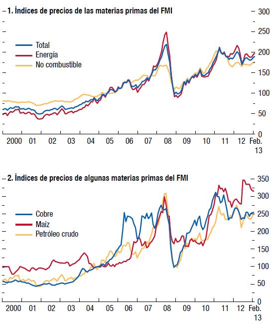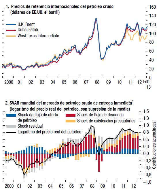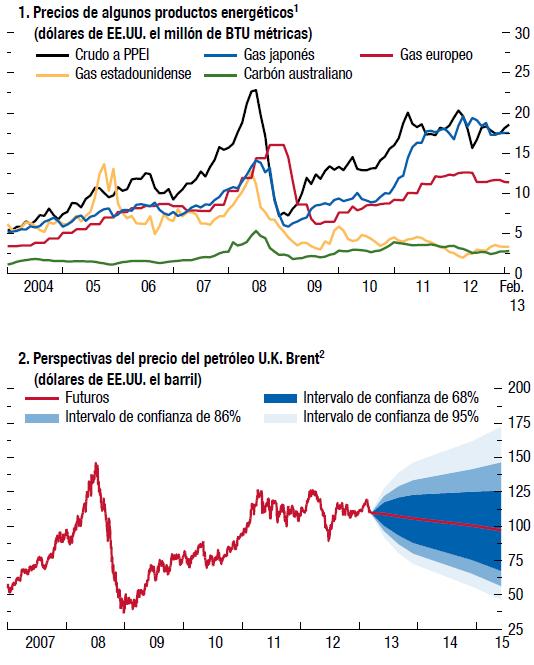 6 Dólares de EE.UU. por barril: Promedio simple de los precios al contado de las variedades U.K. Brent, Dubai Fateh y West Texas Intermediate. Las líneas puntuadas indican el precio del petróleo proyectado en las ediciones del informe WEO de octubre de 2012 y la actual.Las condiciones financieras y monetarias se han tornado más favorables