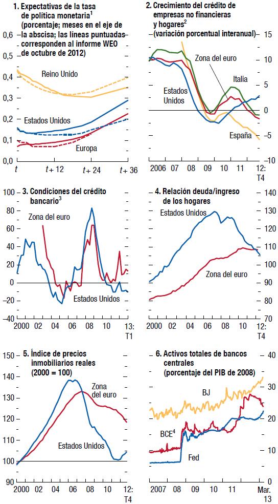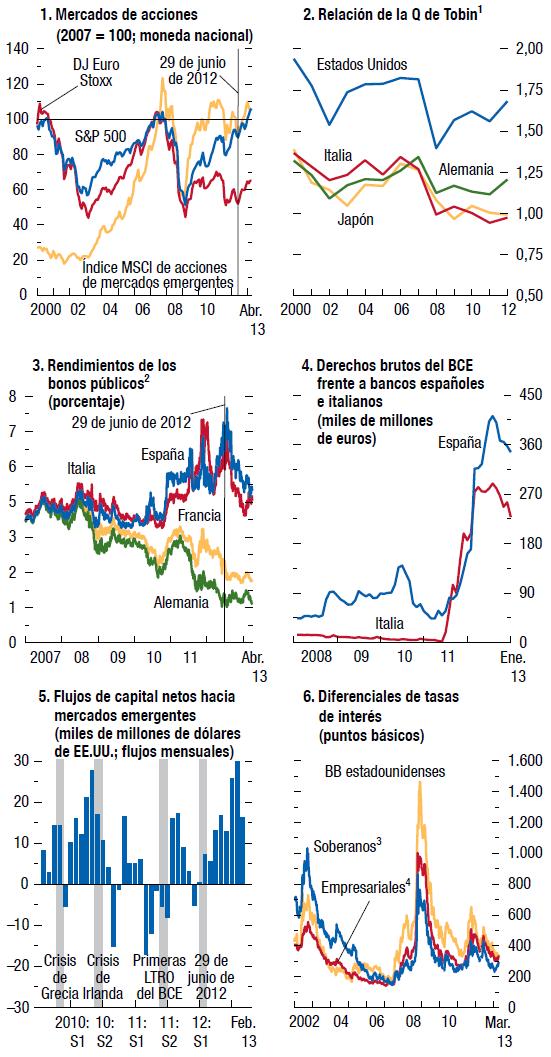 En los últimos seis meses, las autoridades de las economías avanzadas han logrado conjurar dos de las principales amenazas a corto plazo para la recuperación mundial: la amenaza de una ruptura de la zona del euro y una brusca contracción fiscal en Estados Unidos provocada por la caída en un "abismo fiscal". En respuesta, los mercados financieros han registrado un repunte generalizado. Además, la estabilidad financiera ha mejorado, como se destaca en la edición de abril de 2013 del informe sobre la estabilidad financiera mundial (Global Financial Stability Report, o informe GFSR).