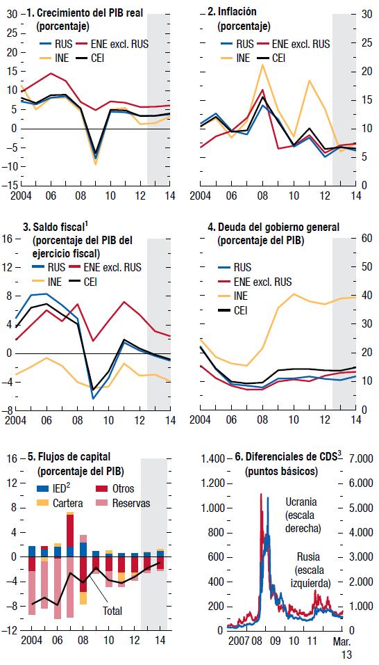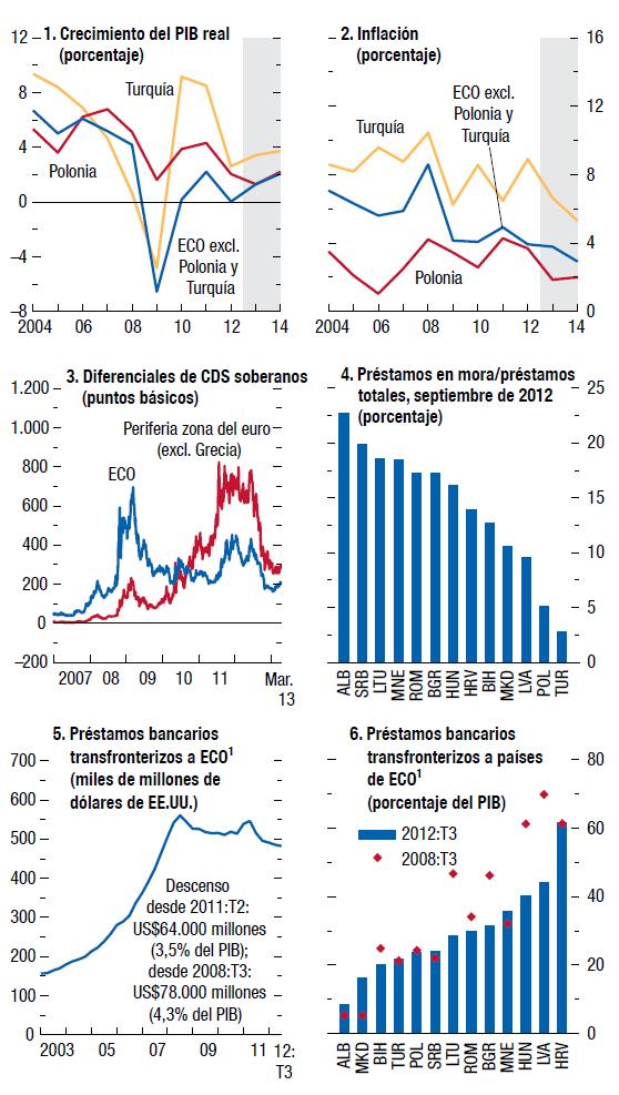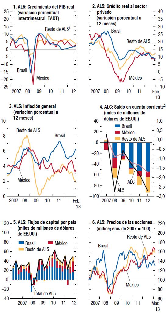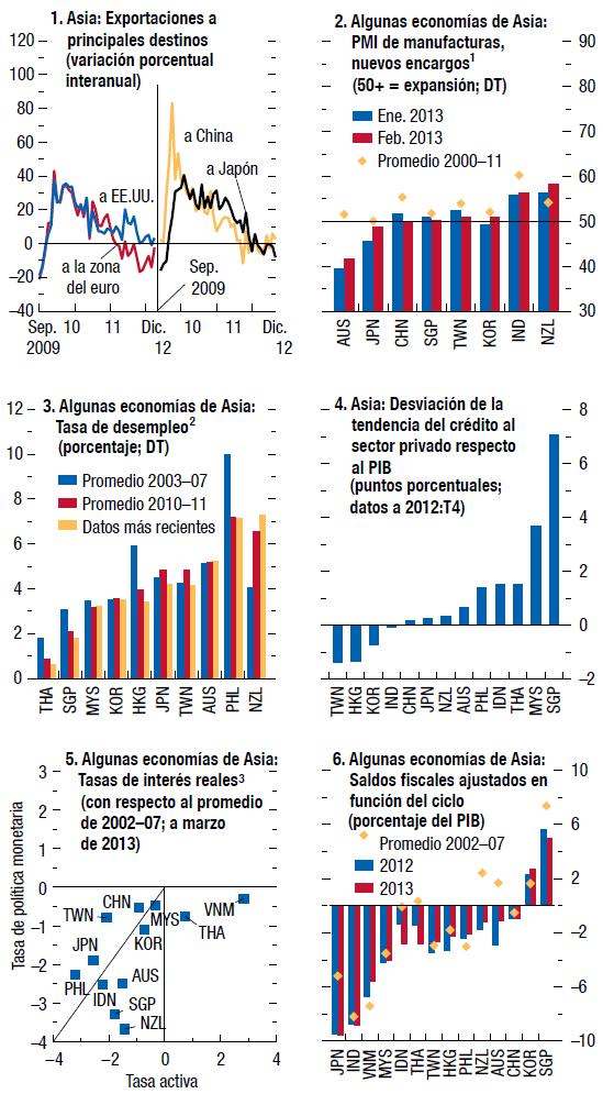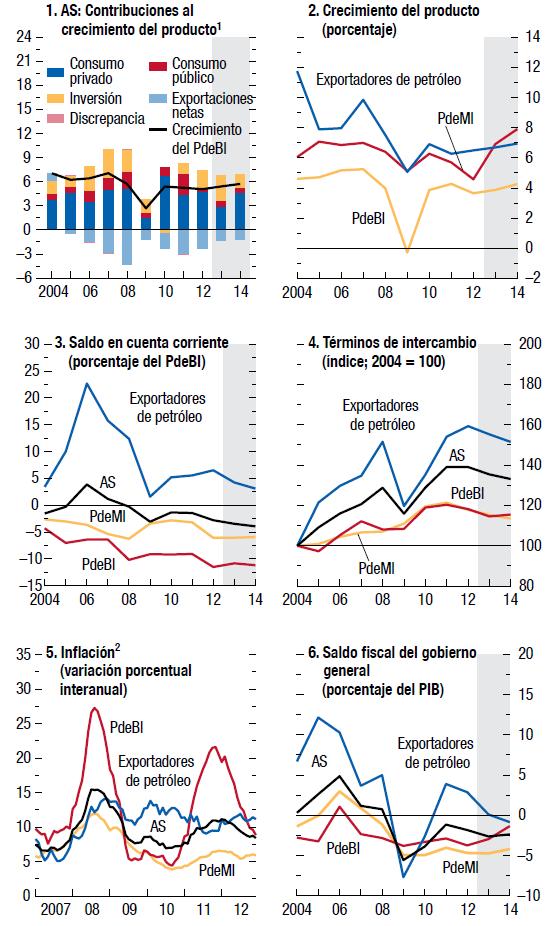 Las economías de mercados emergentes y en desarrollo sufrieron una notable desaceleración durante 2012, debida a una marcada contracción de la demanda proveniente de economías avanzadas clave, la aplicación de políticas internas más restrictivas y el final del auge en algunas de las principales economías de mercados emergentes. Pero ante la solidez de la demanda de consumo, el compás de espera en que se encuentra la política macroeconómica y la reactivación de las exportaciones, la mayoría de las economías de Asia y África subsahariana y muchas economías de América Latina y la Comunidad de Estados Independientes están ahora logrando un mayor crecimiento. La recuperación debería volver a acelerarse en las economías emergentes de Europa a la par del repunte paulatino de la demanda de las economías avanzadas de Europa. No obstante, las economías de Oriente Medio y Norte de África continúan atravesando difíciles procesos internos de transición. Y un par de economías de América del Sur están enfrentando altos niveles de inflación y una presión creciente en los mercados cambiarios.