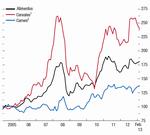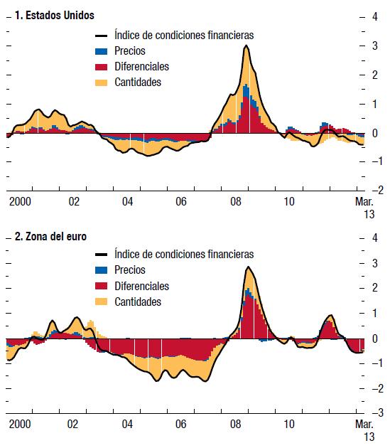 (Positivo = endurecimiento; desviaciones estándar con respecto a la media)Las condiciones financieras se contrajeron drásticamente hacia finales de 2011 a medida que se deterioraban las perspectivas económicas y que se intensificaban las tensiones en la zona del euro. Más recientemente, la confianza del mercado se ha reforzado gracias a la mejora de las perspectivas de crecimiento y a medidas de política más sólidas. Como consecuencia, los diferenciales de riesgo han disminuido. Se prevé que las condiciones financieras seguirán relajándose a medida que continúe afianzándose el crecimiento mundial.
