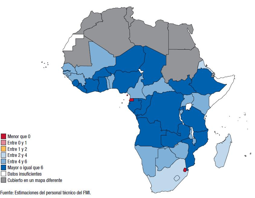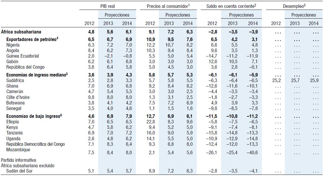 6 Incluye Benin, Burkina Faso, Burundi, Comoras, Eritrea, Gambia, Guinea, Guinea-Bissau, Liberia, Madagascar, Malawi, Malí, Níger, la República Centroafricana, Rwanda, Santo Tomé y Príncipe, Sierra Leona, Sudán del Sur, Togo y Zimbabwe.En 2014, se proyecta que el crecimiento económico de la región será de alrededor de 6%. Un importante factor del crecimiento en 2014 será el fortalecimiento de la actividad en Sudáfrica y otros países de mediano ingreso, sobre la premisa de mejores condiciones externas. Análogamente, se prevé un mejor desempeño en algunos países de bajo ingreso y países frágiles, entre ellos países que actualmente están atravesando por conflictos internos.