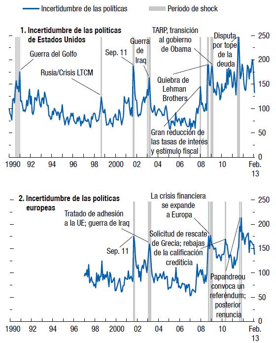 Una opinión común es que la gran incertidumbre general y, más concretamente, la gran incertidumbre en torno a las políticas, ha restringido la inversión y el crecimiento del producto a nivel mundial en los últimos dos años. Gran parte de la incertidumbre en torno a las políticas se originó en Estados Unidos, con la controversia sobre el tope de la deuda de agosto de 2011 y las negociaciones sobre el "abismo fiscal" de diciembre de 2012. La incertidumbre en torno a las políticas también ha sido elevada en Europa, especialmente tras el llamado del Primer Ministro griego, George Papandreou, a un referendo sobre el plan de salvataje griego (y su posterior dimisión) en noviembre de 2011, y durante las negociaciones sobre una respuesta paneuropea a la crisis durante gran parte de 2012. Preocupan a autoridades y dirigentes empresariales del mundo entero las implicaciones de esa incertidumbre en Estados Unidos y Europa, las dos economías más grandes del mundo.