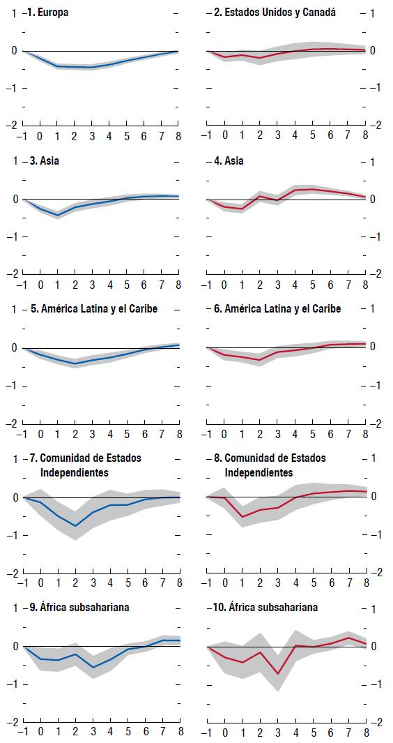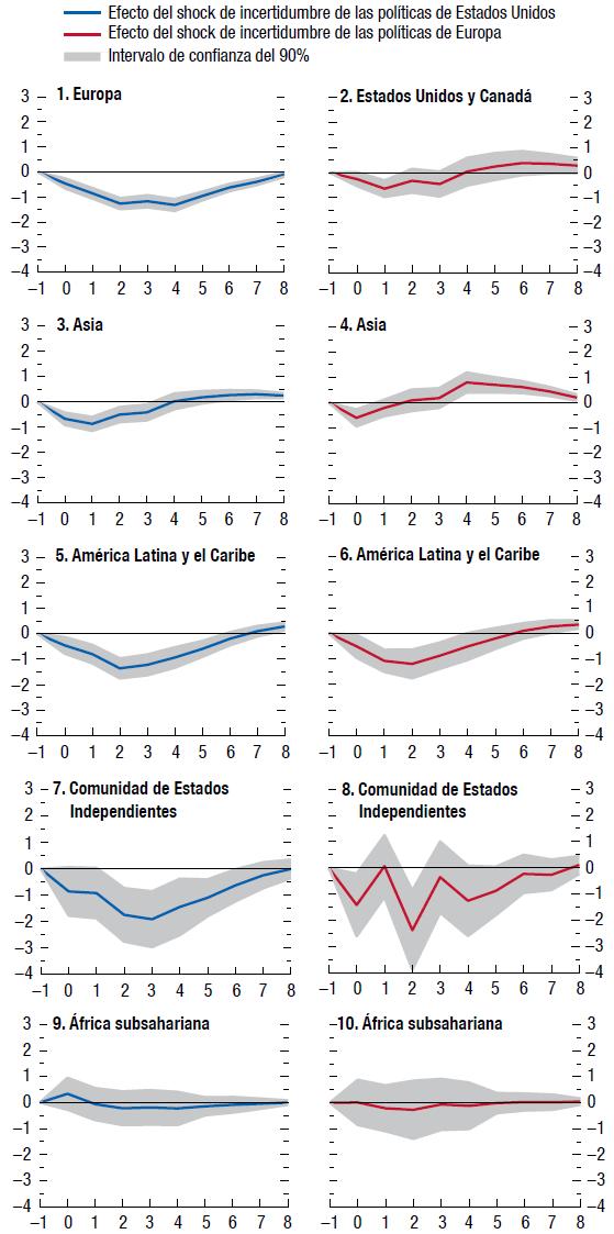 Los shocks de incertidumbre en torno a las políticas en Estados Unidos y Europa tienen un efecto negativo en la actividad real de otras regiones. Su magnitud, persistencia y significancia estadística varían de una región a otra. En general, el efecto de los shocks de incertidumbre de las políticas en Estados Unidos tiende a ser ligeramente mayor y más persistente que el de shocks de incertidumbre de las políticas europeas, y los shocks de Estados Unidos afectan más a Europa que a la inversa.Haga click para ampliar