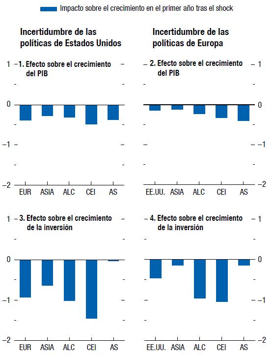 El análisis lleva a pensar que los fuertes aumentos de la incertidumbre en torno a las políticas estadounidenses y europeas en el pasado han reducido provisionalmente y en distintos grados la inversión y el producto de otras regiones. El análisis apunta a la posibilidad de que una disminución marcada de la incertidumbre en torno a las políticas de Estados Unidos y Europa a corto plazo contribuya al aumento de la inversión y el producto a escala mundial.