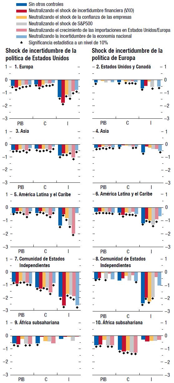El análisis aborda la posibilidad de que el indicador de la incertidumbre en torno a las políticas esté captando los efectos de otras variables controlando por la incertidumbre general, la confianza decreciente o una reducción de la actividad económica estadounidense o europea. Cabe señalar que los resultados pueden interpretarse de dos maneras: