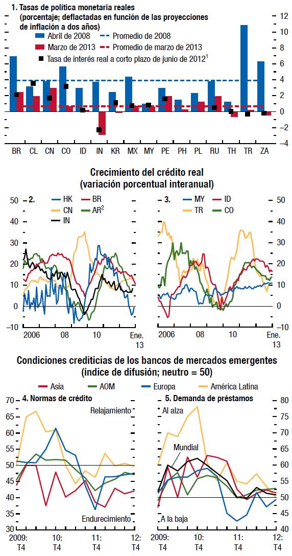 En las economías de mercados emergentes, las tasas de Interés de política monetaria han caído en los últimos seis meses. Además, el ritmo de crecimiento del crédito real ha menguado conforme ha disminuido la demanda de préstamos, aunque en muchas economías permanece en un nivel que en general se considera alto. La demanda de préstamos ha estado desacelerándose, excepto en las economías emergentes de Europa, que están recuperándose de un colapso del crédito. Las normas de crédito han tendido a ser más restrictivas desde 2011, pero últimamente son menos restrictivas.Haga click para ampliar