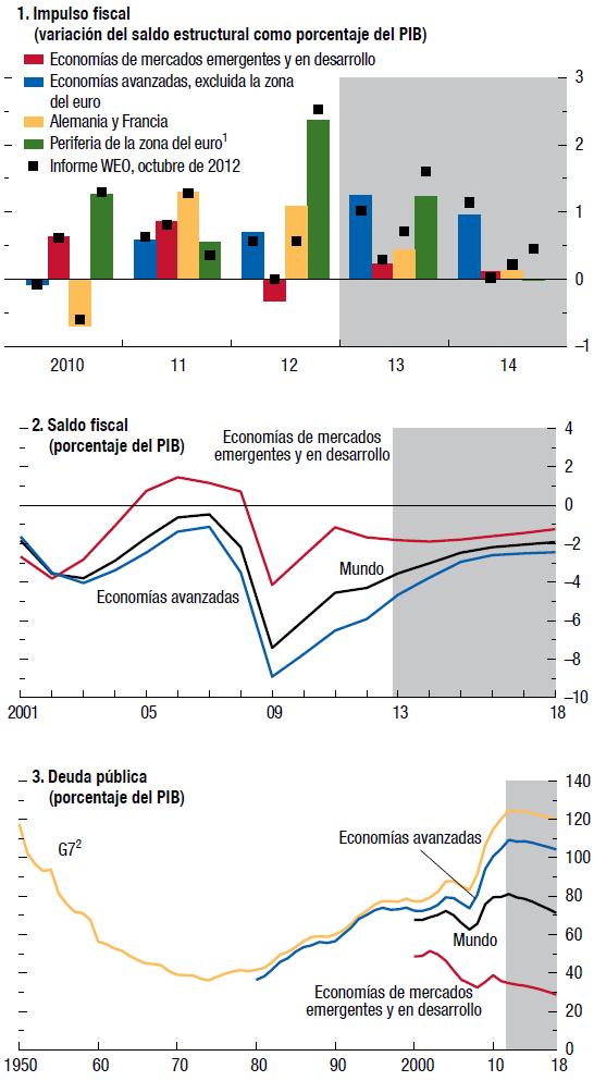 La política fiscal seguirá siendo restrictiva en las economías avanzadas y permanecerá en general neutra en las economías de mercados emergentes y en desarrollo. El ritmo de contracción disminuirá considerablemente en la zona del euro en 2013-14. En las economías avanzadas se pronostica que los coeficientes de endeudamiento se estabilizarán pronto, pero que volverán a aumentar a mediano plazo debido al gasto en prestaciones sociales. En las economías de mercados emergentes y en desarrollo se proyecta que los coeficientes de endeudamiento seguirán reduciéndose gracias a un crecimiento vigoroso y al bajo nivel de las tasas de interés.Haga click para ampliar