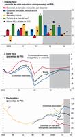 Los indicadores de la actividad manufacturera apuntan a que la reaceleración en las economías de mercados emergentes está bastante bien encaminada pero que la actividad en las economías avanzadas está recién empezando a estabilizarse, ya que se ha visto reprimida por importantes debilidades en la periferia de la zona del euro y Japón. El crecimiento del consumo menguó marginalmente durante la más reciente desaceleración. Sin embargo, la inversión se ha estancado en medio de la contracción del producto y el comercio manufacturero. Esto puede haber traído aparejado una reducción de inventarios, lo cual sienta las bases para una recuperación impulsada por la reposición de dichos inventarios.Haga click para ampliar