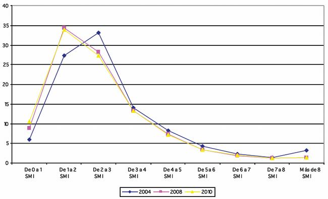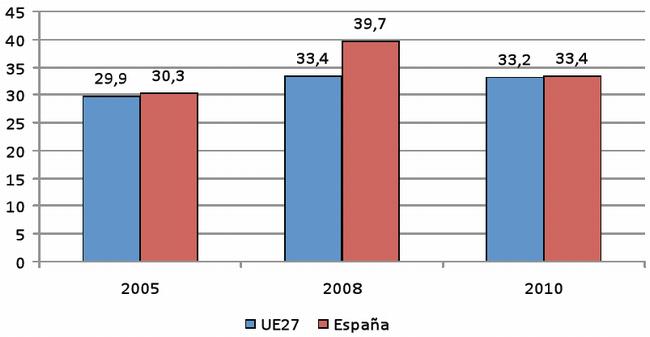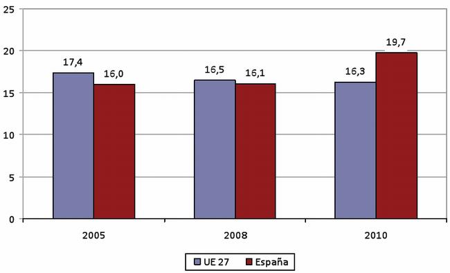 9. En este apartado se analiza la situación de los trabajadores en riesgo de pobreza, a partir de la información recabada por la "Statistics of Income and Living Conditions'. Los últimos datos disponibles de trabajadores en riesgo de pobreza se corresponden al año 2010, algo que tan sólo permite un acercamiento a la primera etapa de la crisis económica. En todo caso, los datos de los años 2005, 2008 y 2010 pueden ser suficientes para conocer las tendencias de los últimos años. La lectura de estos datos no es sencilla, dado que combinan dos universos de estudio: el individual y el de los hogares. En el riesgo de pobreza, de tal manera, se unen diversos contextos referidos a las condiciones socioeconómicas de las unidades de convivencia, su participación en el empleo, las condiciones salariales de los individuos. A esto hay que añadir los diferentes componentes de los ingresos, que no son tan sólo salariales, sino también otros ingresos privados así como las transferencias sociales. [Volver]