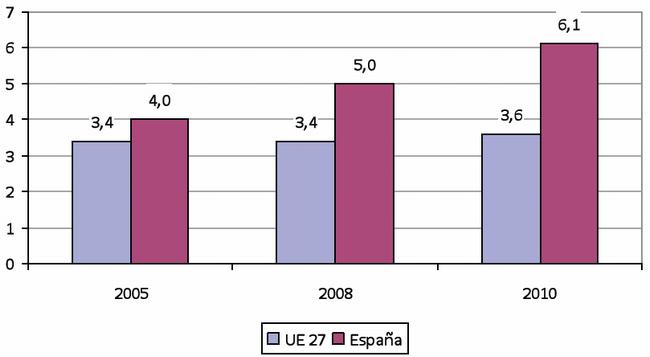 6. La tasa de riesgo de pobreza ha pasado en España de 19,6% en 2008 a 21,8% en el año 2011. [Volver]