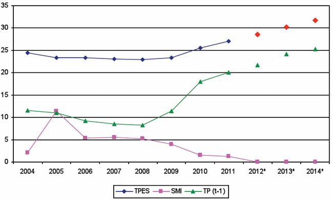 Nota: TPES: Tasa de pobreza y exclusión social, *Previsión de la Tasa de pobreza para el periodo 20122014. Estimaciones de la tasa de paro (2012-2013) y estimaciones del SMI (2013-2014). TP (t-1): Tasa de paro en el año anterior. SMI: Salario Mínimo Interprofesional Fuente: Periodo 2004-2011, INE, Eurostat y elaboración propia.