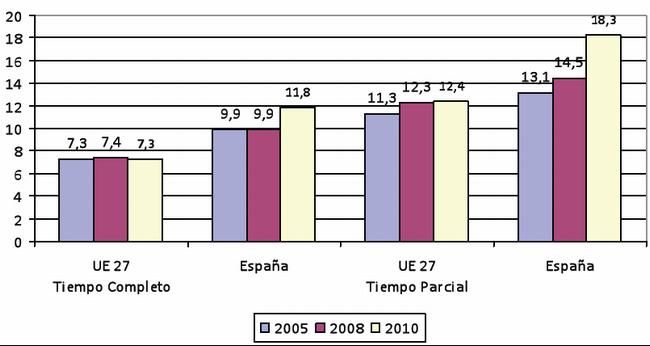 Dentro de este último colectivo, el 13,5 por ciento de quienes trabajan con contratación temporal, en gran medida jóvenes, vive por debajo del umbral de pobreza; el caso del trabajo a tiempo parcial, ocupado en su mayoría por mujeres, implica mayor nivel de pobreza: el 18,5 por ciento de quienes trabajan bajo esta modalidad contractual se encuentran en esta situación.