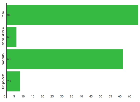 Las televisiones privadas son la excepción, en este sentido, puesto que consiguieron beneficios multimillonarios durante 2016 (Mediaset, 171 millones de euros y Atresmedia, 129) debido, principalmente, a la privilegiada situación duopolística de la que gozan en la TDT, que les permite acaparar el 85% de la publicidad que se contrata en este sector y el 50,3% del total del mercado. Pero otros medios tradicionales han terminado el año en serias dificultades que condicionan sus proyectos y provocan temblores y rezos en sus redacciones: Prisa perdió 68 millones de euros, Vocento, 60; Unidad Editorial, 5,4 y Grupo Zeta, 7,7.
