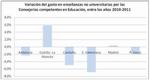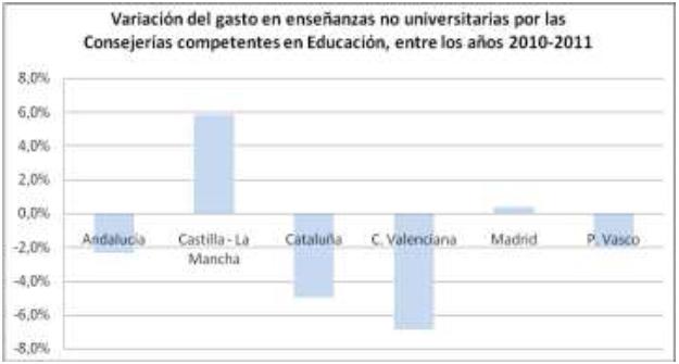 5. Devolution of education competences allows each Autonomous Community to adapt its strategies to the existing socio-economic context. Thus, analyzing the 2010-2011 variation of expenditure in non-university education by Autonomous Communities through its departments, we find such disparate examples as the Valencian Community (almost 7% decrease), Catalonia (5% decrease), the Basque Country and Andalusia (2,5% decrease), Madrid (almost 0,5% increase), and Castilla-La Mancha (almost 6% increase).