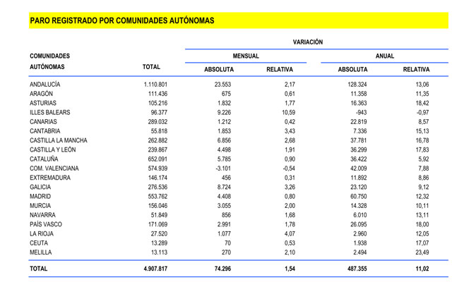 A destacar la enorme divergencia que existe entre comunidades autónomas en la evolución del desempleo en términos anuales. Mientras que en Baleares desciende el paro registrado un 0,97% en los últimos doce meses, en el País Vasco crece a un ritmo del 18%, en línea con lo que ocurre en las dos castillas. En Cataluña, por el contrario, el paro aumenta a un ritmo del 6%, casi la mitad que en la media del país.