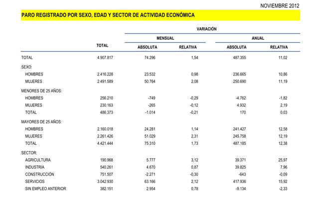 Como consecuencia de ello, el número de parados registrados en las oficinas públicas de empleo alcanza un nuevo máximo histórico, hasta los 4.907.817 desempleado, lo que refleja las dificultades de la economía española para crear puestos de trabajo. En términos desestacionalizados -según la metodología del Ministerio de Economía- noviembre se cerró con 49.450 parados más, por debajo de la cifra que no elimina el efecto calendario, pero aun así, el paro registrado ha crecido en nada menos que 487.355 personas en los últimos doce meses. O lo que es lo mismo, aumenta todavía a un ritmo del 11% anual después de un lustro en recesión. No hay, por lo tanto, signos relevantes que indiquen un cambio de tendencia.