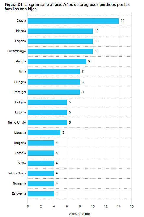 El paisaje que ha dejado la recesión a su paso es desolador: los ingresos medios de los hogares con hijos se han reducido casi a la mitad, el porcentaje de hogares que no pueden permitirse comprar carne o pescado cada dos días se ha duplicado en Estonia, Grecia e Italia y la incapacidad para abordar gastos imprevistos ha aumentado el 60% en los 12 países más afectados.