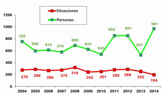 Antes de pasar al análisis pormenorizado de los datos, hay que hacer una primera valoración sobre la paradoja que implica el hecho de que durante el 2014 hubo una reducción del número de situaciones conocidas respecto a las de los dos años anteriores, mientras que se ha visto muy incrementado el número de personas afectadas, lo que nos sugiere que las situaciones de maltrato "colectivo" se han incrementado a lo largo de 2014: