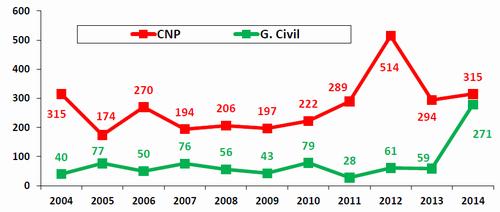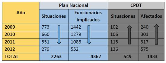 Llama la atención que mientras tanto el número de situaciones como el número de funcionarios implicados registrados por el aplicativo del Plan de Derechos Humanos decrecen de forma anual, el número de afectados y de situaciones registradas por la CPDT- en las que las que los denunciados fueron integrantes de los CFSE- sigue una línea de tendencia contraria.