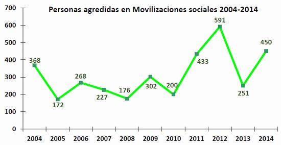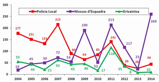 El cuadro anterior muestra como las denuncias aumentan y disminuyen sin que pueda observarse ninguna tendencia reseñable. Lo mismo ocurre con las situaciones de tortura y/o malos tratos, si bien en este caso, con una menor variabilidad. Esto nos obliga a reflexionar sobre las distintas coyunturas que se ocultan en estos datos generales y que habrá que valorar en un análisis más pormenorizado. Por lo pronto, respecto a los últimos 4 años estudiados, si podemos avanzar que aquellos en los que ha habido más movilizaciones sociales (el 2011 y el 2012 en torno al 15M y el 2014 en torno a las movilizaciones de protesta y solidaridad por Gamonal y el desalojo de Can Vies), han supuesto los de mayor número de personas afectadas en toda la serie de datos recogida por los informes de la CPDT.