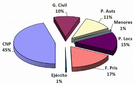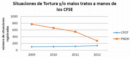 Es importante señalar que el número de situaciones registradas por la CPDT durante el periodo analizado, en las que integrantes de los CFSE fueron denunciados por torturas y/o malos tratos, representan poco más del 51,74% del total de las situaciones registradas por la CPDT. En el resto, un 48,36% del total de las situaciones, las denuncias por torturas y/o malos tratos lo fueron contra funcionarios de las policías autonómicas, policías municipales o funcionarios de centros de reclusión. De este modo se identifica la existencia un elevado número de situaciones de torturas y/o malos tratos denunciadas que no están siendo registradas por la aplicación del Plan de Derechos Humanos.