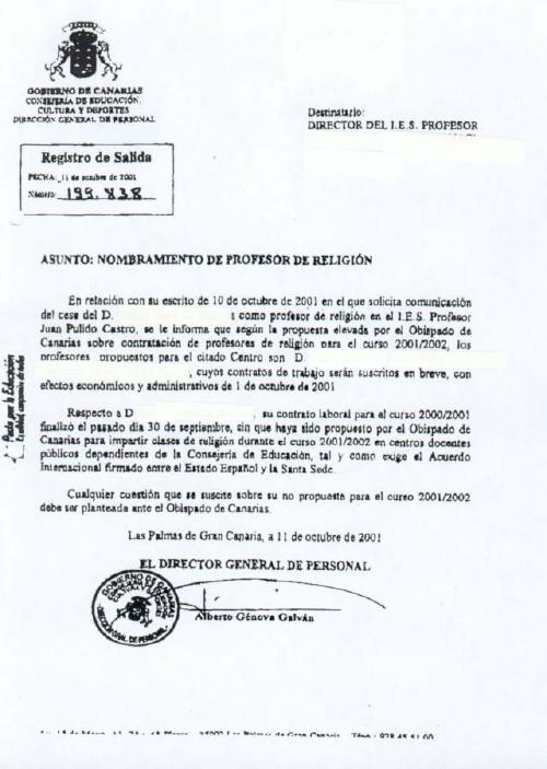 En relación con su escrito de 10 de octubre de 2001 en el que solicita comunicación del cese del D...............................como profesor de religión en el I.E.S. Profesor Juan Pulido Castro, se le informa que según propuesta elevada por el Obispado de Canarias sobre contratación de profesores de religión para el curso 2001/2002, los profesores propuestos para el citado Centro son D........................................y D......................................., cuyos contratos de trabajo serán suscritos en breve, con efectos económicos y administrativos de 1 de octubre de 2001.