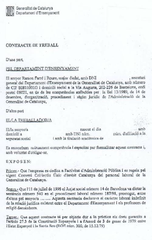 Modelo de contrato de trabajo de duración determinada de la Generalitat de Catalunya para los profesores de religión católica pagados con fondos públicos.