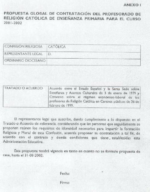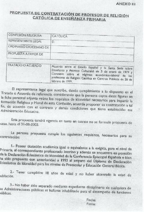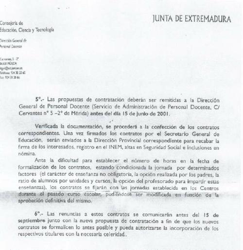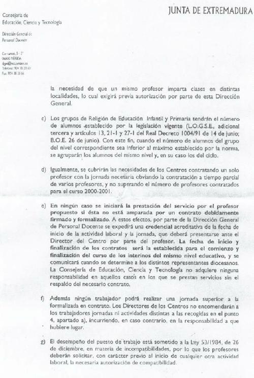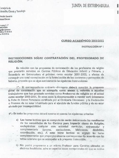 Instrucciones sobre contratación y modelo de contrato de trabajo de duración determinada propuesto por la Junta de Extremadura para los profesores de religión católica pagados con fondos públicos.