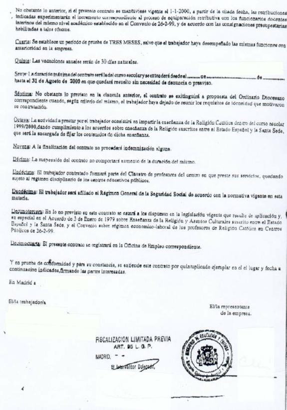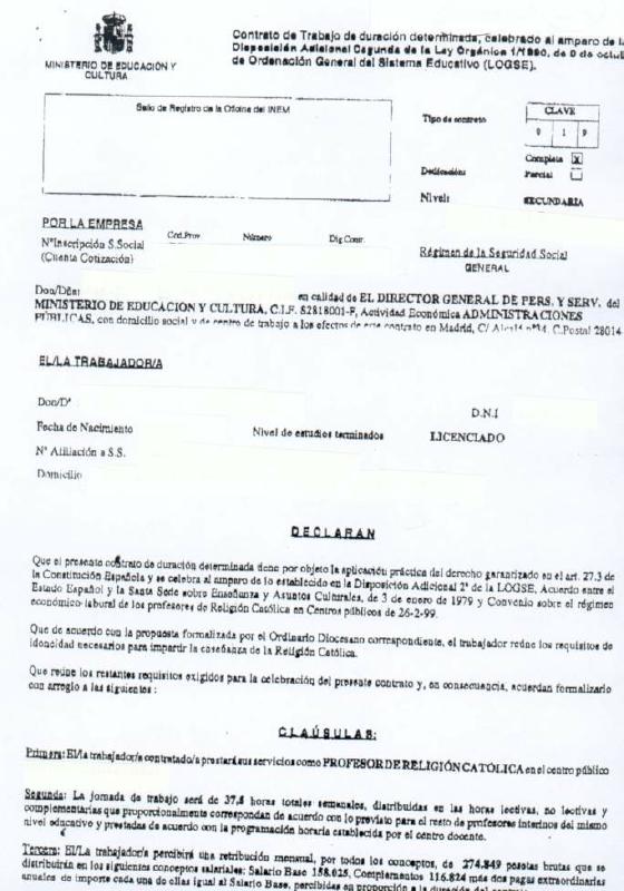 Modelo de contrato de trabajo de duración determinada del Ministerio de Educación y Cultura para los profesores de religión católica pagados con fondos públicos.