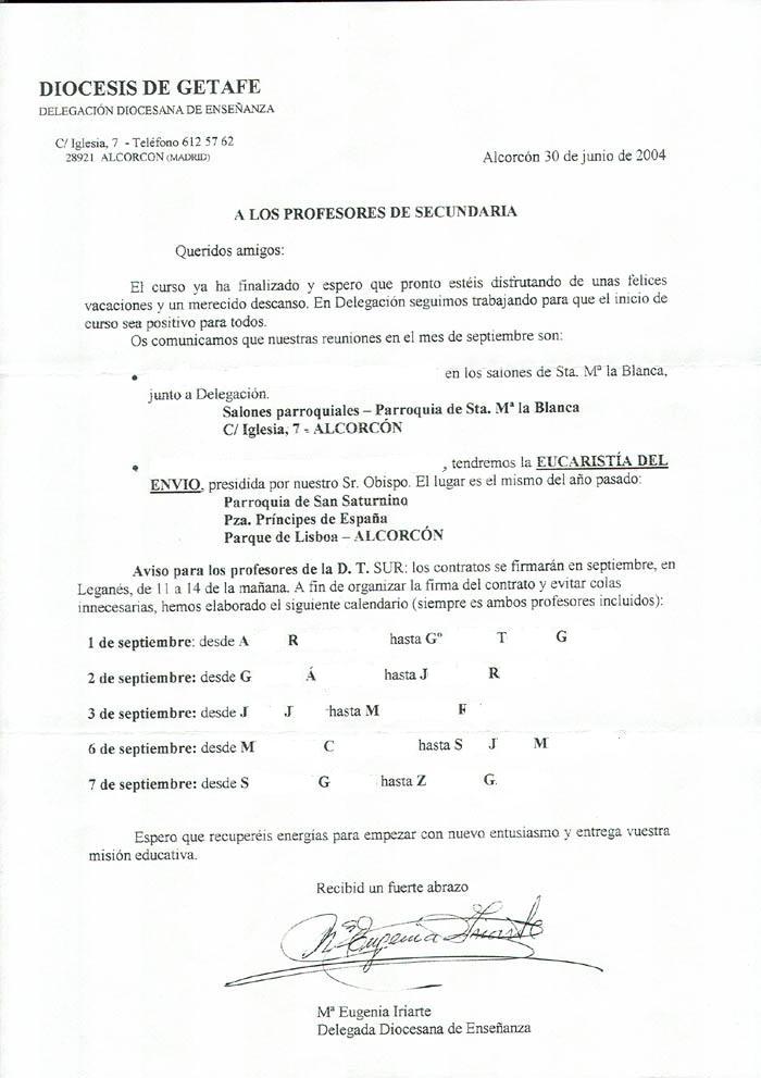 La Diócesis de Getafe, y no la CAM, insta a la firma de contratos a los docentes de religión. Facsímil del documento original DDHH en España Este documento ha sido publicado el 28ago04 por el Equipo Nizkor y Derechos Human Rights