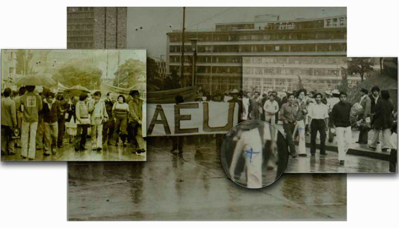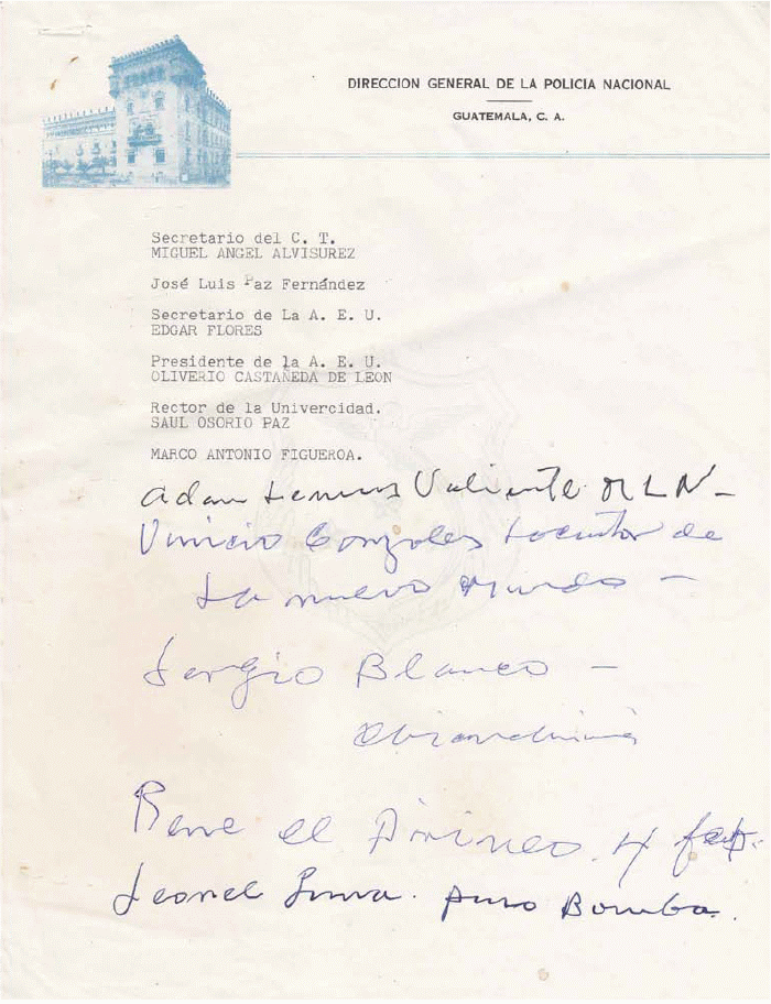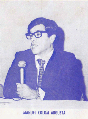 1. La foto corresponde a un volante del Frente Unido de la Revolución –FUR- archivado por la PN, en: GT PN 50 S002 01.02.1978, informe confidencial, Ref. 461 [Registro interno AHPN 12862]. [Volver]