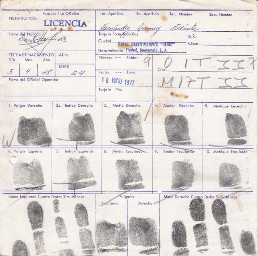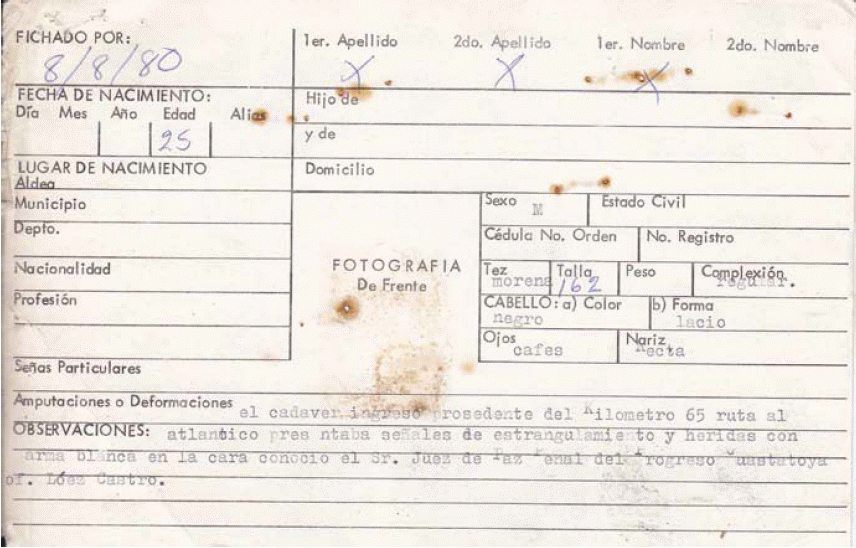 26. Óp.cit., GT PN 49-02 S004 12.08.1980, oficio No. 560/fvn., dirigido al Juez de Paz Penal, Villa Nueva, Guatemala, remitió el Jefe del Gabinete de Identificación y experto en tribunales [Registro interno AHPN 31064].