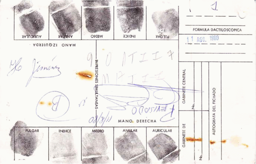 Óp.cit., GT PN 49-02 S004 14.08.1980, oficio No. 574/fvn, dirigido al Director General de la PN, remitió el Jefe del Gabinete de Identificación y experto en tribunales [Registro interno AHPN 31071]. [Volver]