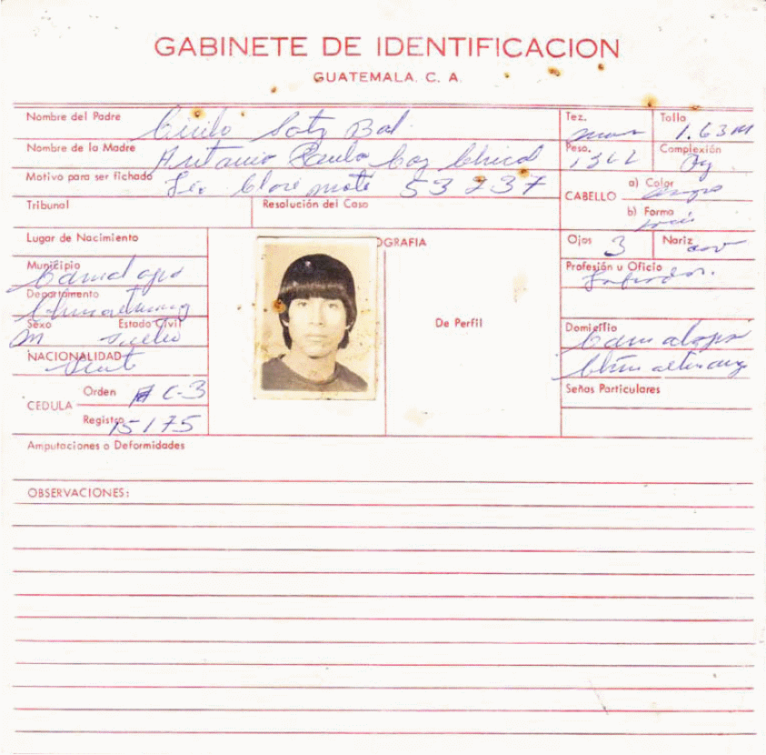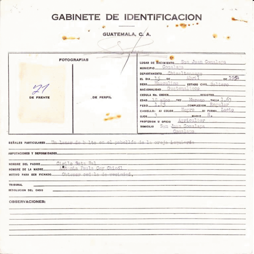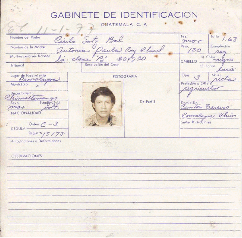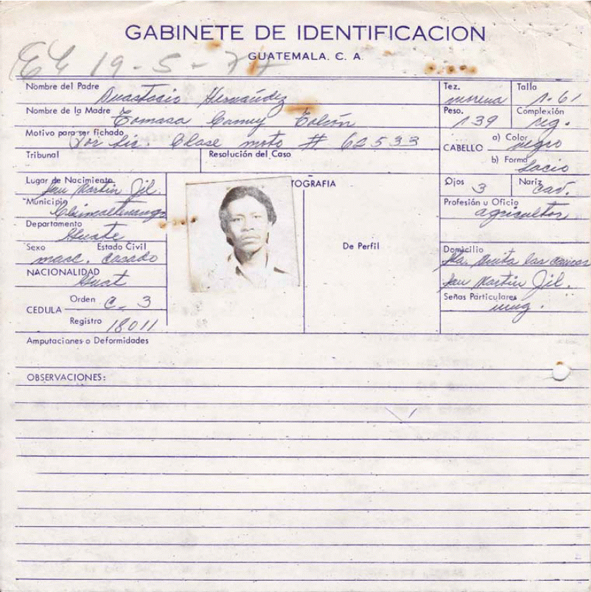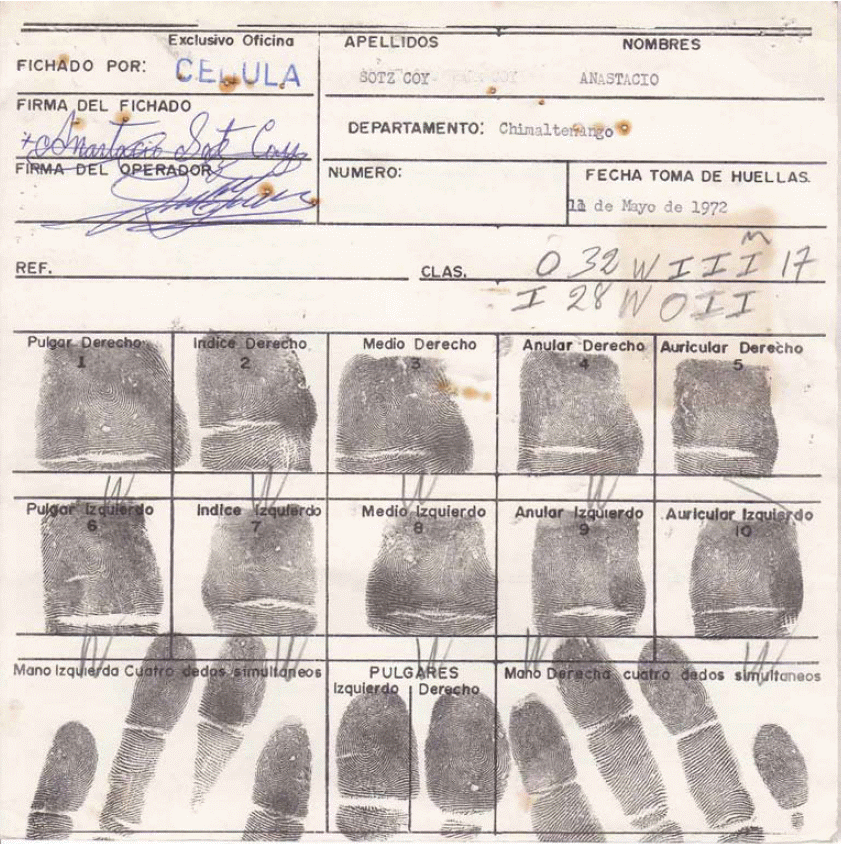 25. Óp.cit., GT PN 49-02 S004 11.05.1972, ficha de gabinete de identificación para la obtención de cédula de vecindad de Anastacio Sotz Coy [Registro interno AHPN 31075].