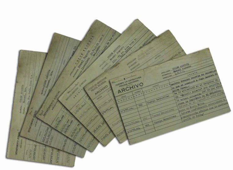 -Libros de detenidos.-Fichas con información de delitos “políticos”, de control de licencias para conducir, fichas de cédula de vecindad, fichas post mortem del Gabinete de Identificación.