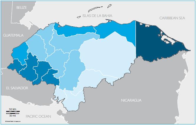 Honduras ocupa un área de 112.492 km2 y concentra una población de 8.215.313 de habitantes (datos del 2011). |7| Se calcula que los pueblos indígenas representan entre el 7 y el 13% del total de la población, repartidos en los nueve pueblos culturalmente diferenciados como Pech, Nahuas, Lencas, Tolupanes, Garífunas, Misquitos, Tawahkas y Chortí. |8| Este país forma parte del "grupo norte" de países centroamericanos junto con Guatemala y El Salvador, con los que comparte fronteras y también algunos elementos comunes en sus características geográficas, históricas, sociales y económicas.