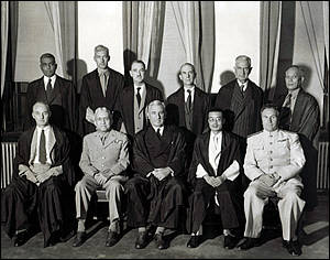 International Military Tribunal for the Far East July 29, 1946 International Justices for the IMTFE Front (L to R): Patrick, Cramer, Webb, Mei, and Zaryanov. Back (L to R): Pal, Röling, McDougall, Bernard, Northcroft, and Jaranilla. The National Archives WPA-46-66767 |