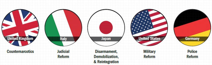 In 2002, the United States and its coalition partners concluded that the development of an internationally trained and professional Afghan national security force could serve as a viable alternative to an expansion of international forces in Afghanistan. Despite being ill-prepared and lacking proper doctrine, policies, and resources, the United States took the lead for building the ANA. Coalition partners accepted responsibility for other efforts: police reform (Germany), counternarcotics (United Kingdom), judicial reform (Italy), and disarmament, demobilization, and reintegration (Japan). General Karl Eikenberry, the first Security Sector Coordinator in Afghanistan, remarked that "overall, it might be termed exploratory learning because the many uncertainties of the Afghanistan mission added to the steepness of the learning curve." |1|
