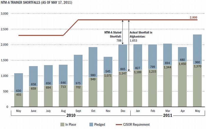 The ANDSF train, advise, and assist effort was chronically understaffed. In 2009, NATO established the NATO Training Mission-Afghanistan (NTM-A) as a partner organization to CSTC-A. In February 2010, when NTM-A/CSTC-A became fully operational, only 1,810 of the required 4,083 trainers were in place. Similar shortages remained as time went on. Even in those areas deemed critical priorities, NTM-A struggled to meet its personnel requirements. In November 2010, for example, about 36 percent of instructor positions seen as critical priorities were unfilled. At a time when the ANA was rapidly expanding toward a force strength goal of 171,600, these staffing shortfalls at training facilities and in the field negatively affected planned ANDSF development. General John Craddock, Supreme Allied Commander Europe from 2006 to 2009, stated that "NATO nations have never completely filled the agreed requirements for forces needed in Afghanistan" since mission inception. |6|