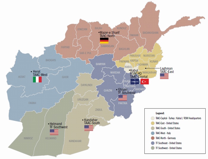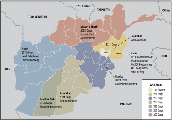 Starting in January 2015, U.S. and NATO forces have provided train, advise, and assist support to the ANDSF at the ANA corps level, the ANP zone level, and within the Ministries of Defense and Interior. Four regional train, advise, and assist commands (TAAC) provide routine support to ANDSF units in close proximity and will "fly-to-advise" to more remote locations, as needed. This posture has significantly decreased U.S. "touch-points" with ANDSF units, causing the United States to rely on ANDSF information to understand the forces' needs and struggles. Leaving some units uncovered, without regular U.S. advisors, proved disastrous in the summer of 2015, as the ANA 215th Corps in Helmand completely collapsed and had to be reconstituted.
